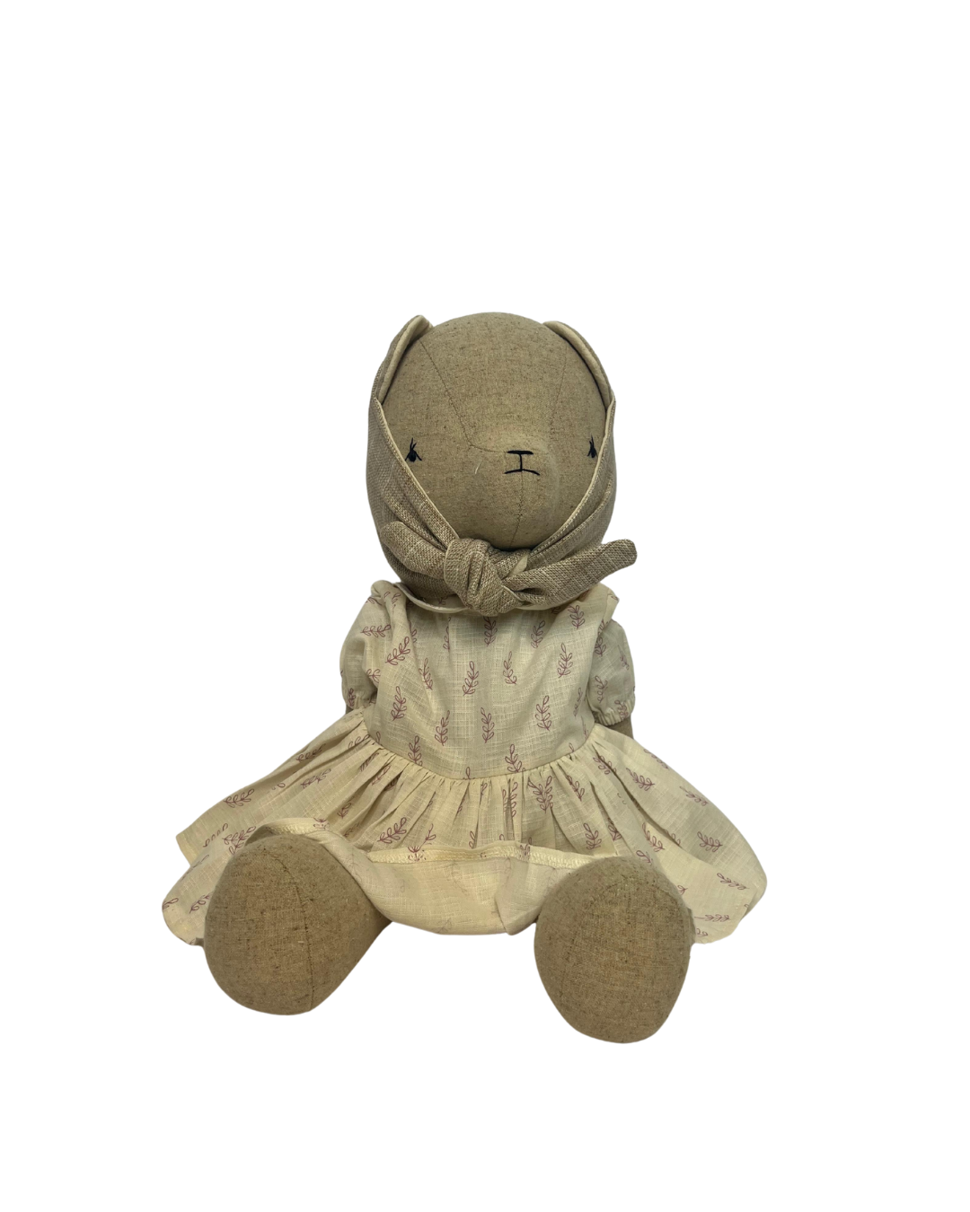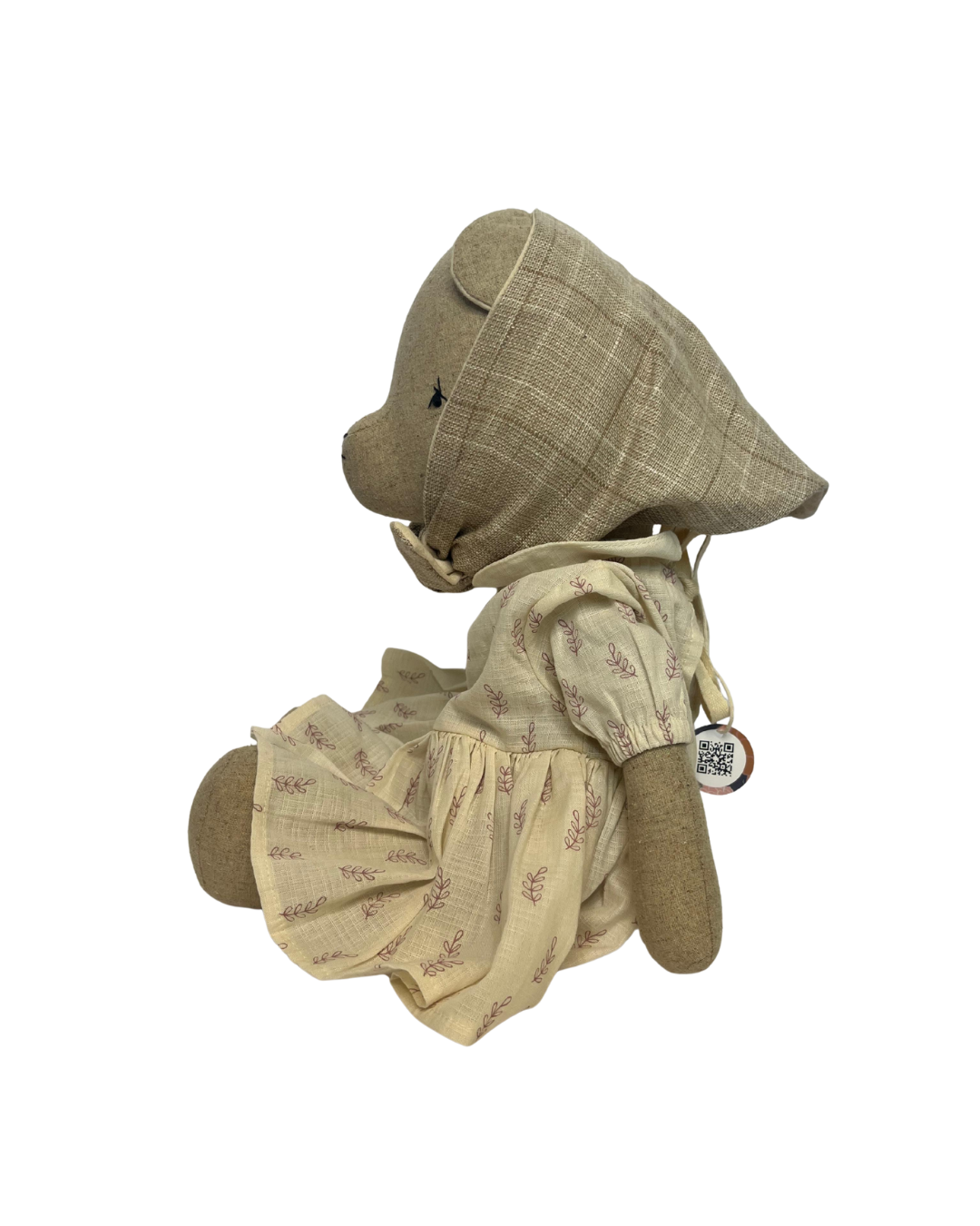 Questa bambola fatta a mano è realizzata in tela di cotone biologico effetto lino e imbottita con fibre ipoallergeniche.