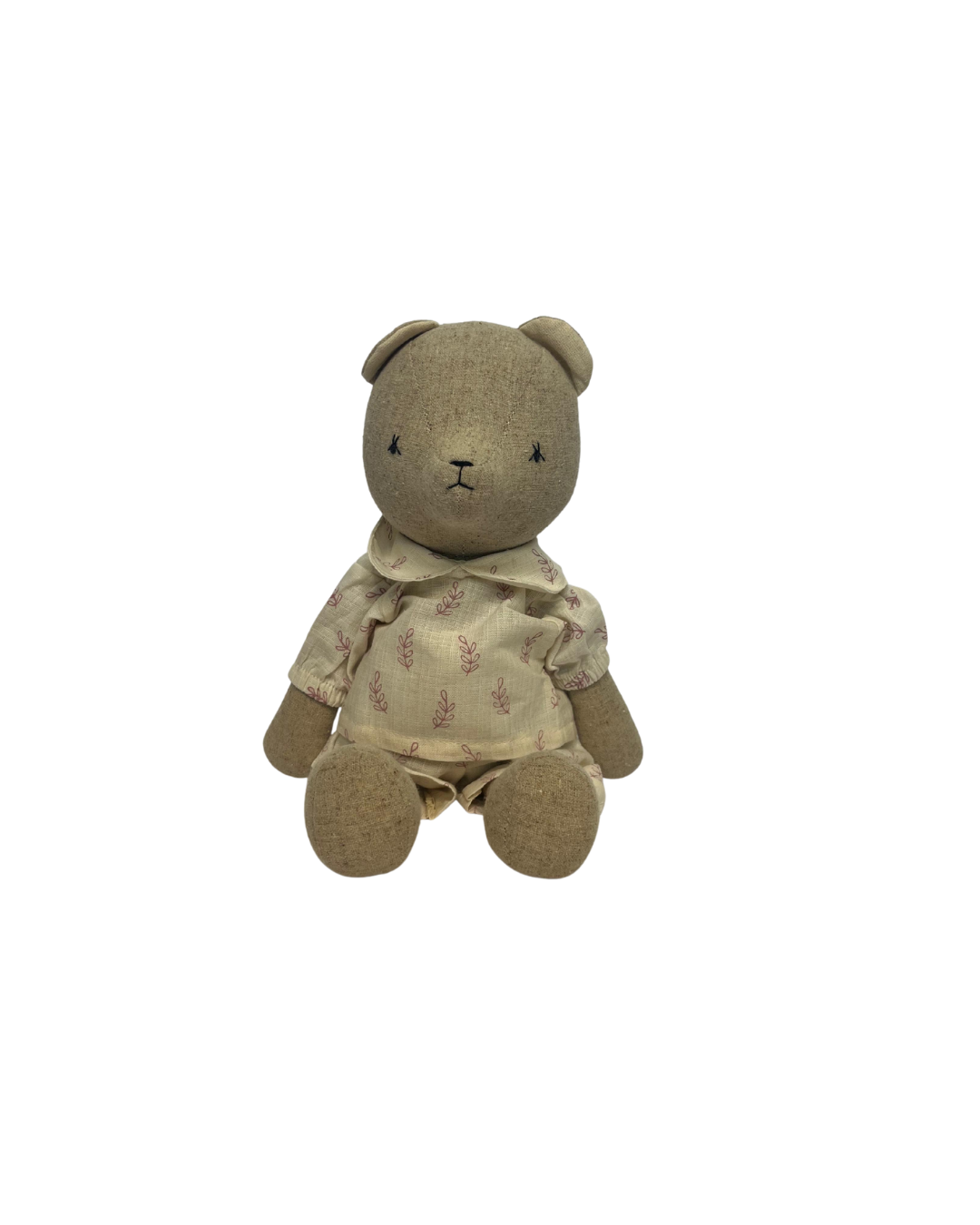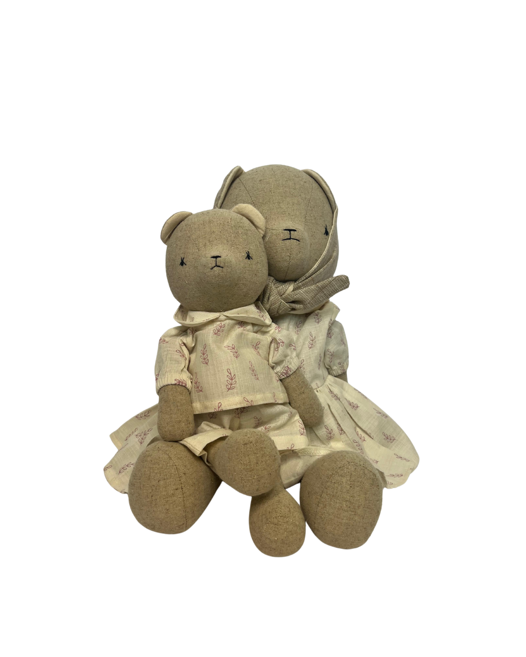 Questa bambola fatta a mano è realizzata in tela di cotone biologico effetto lino e imbottita con fibre ipoallergeniche.