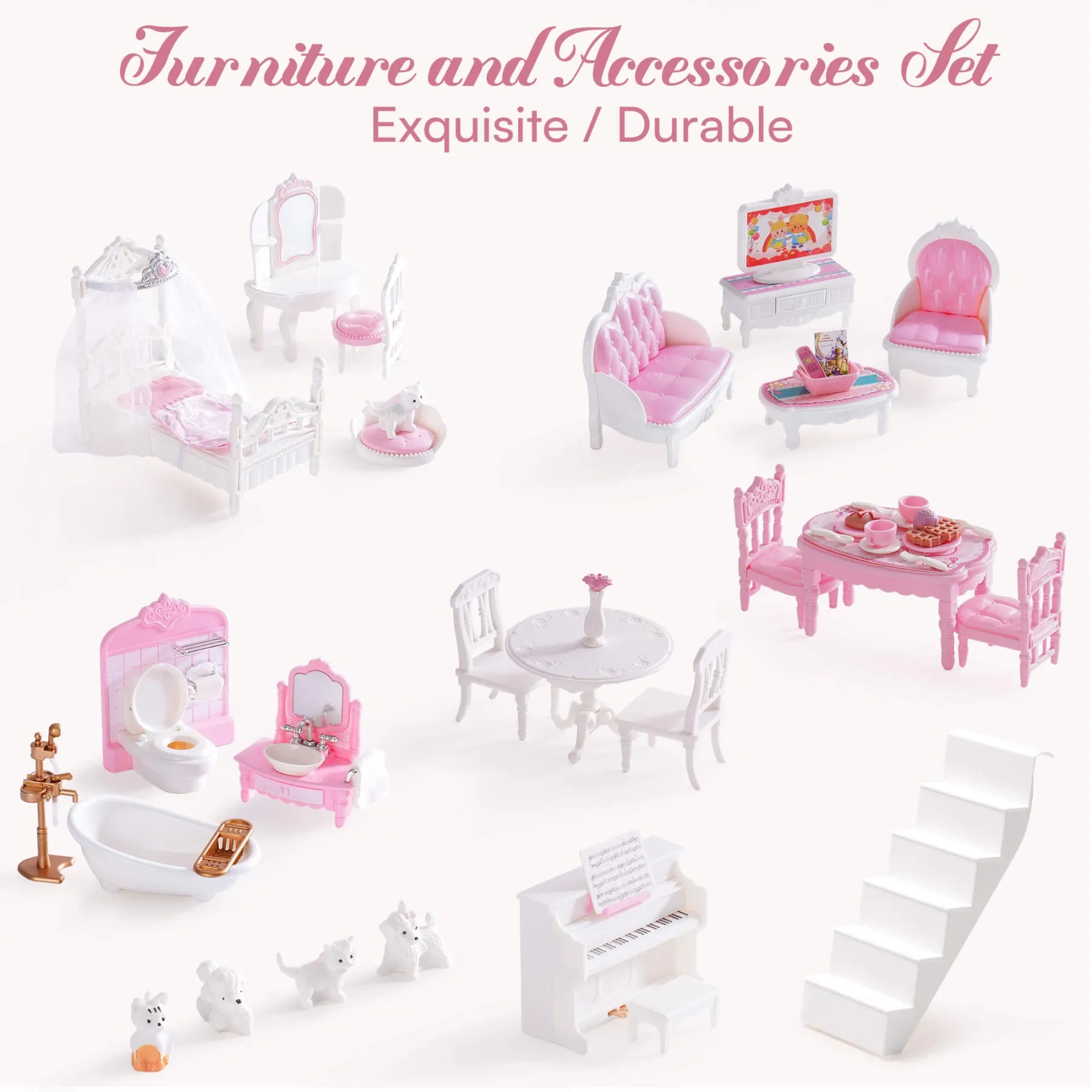 3 LIVELLI & 4 STANZE & MOBILI: La casetta di legno per bambole include cucina, soggiorno, bagno, camera da letto, balcone e ascensore. Include anche 20 accessori in plastica per mobili da bambola, cani e gatti.