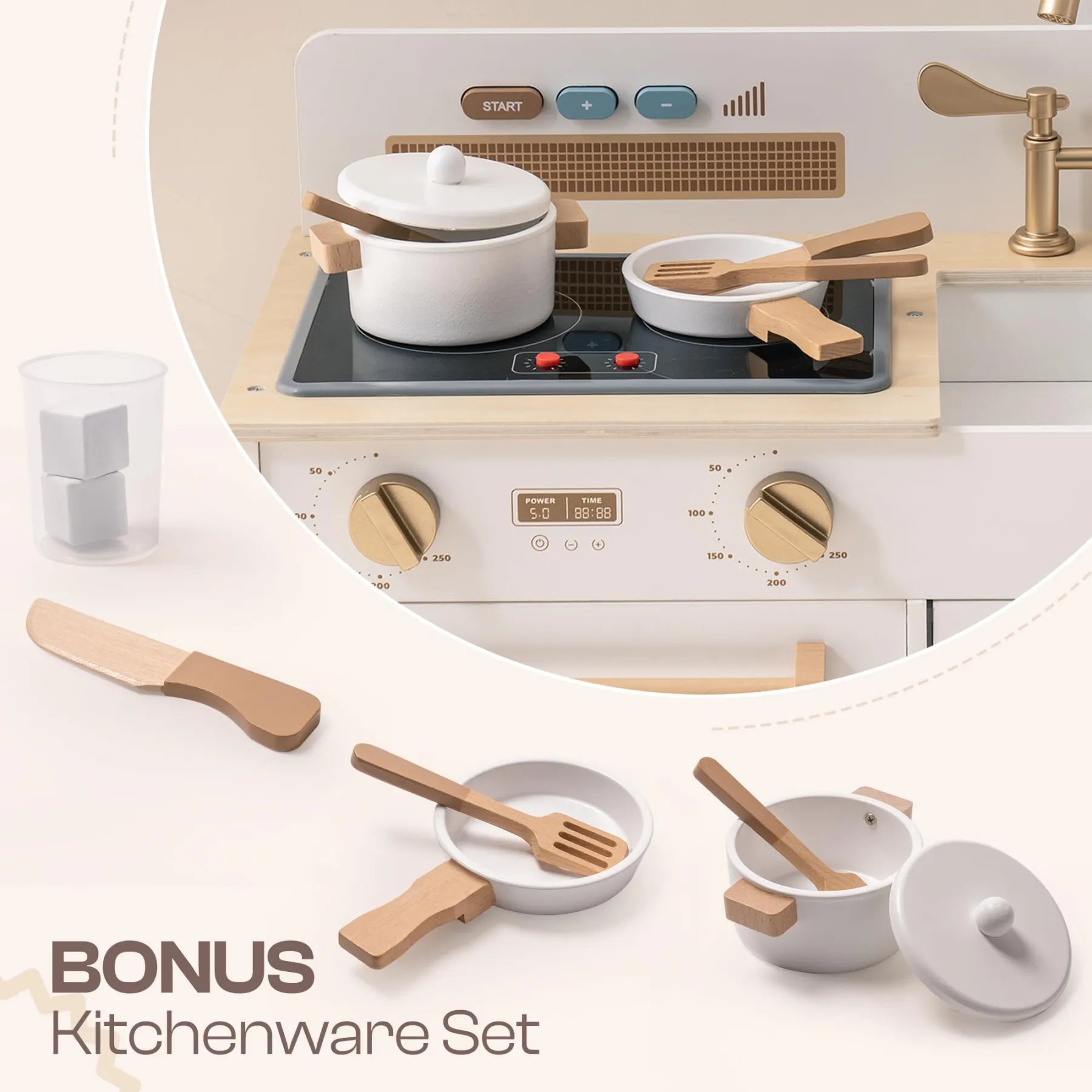 Functional-Play-Kitchen: Eleva il tempo di gioco con la nostra Cucina Giocattolo in Legno ispirata al Montessori! Design bianco chic, maniglie in legno e un rubinetto in metallo lucido trasportano tuo figlio in un mondo di creatività. Il fornello, con luci e suoni, porta la gioia della cucina alla vita. Inoltre, un produttore di ghiaccio integrato aggiunge un tocco fresco per un gioco immaginativo senza fine!