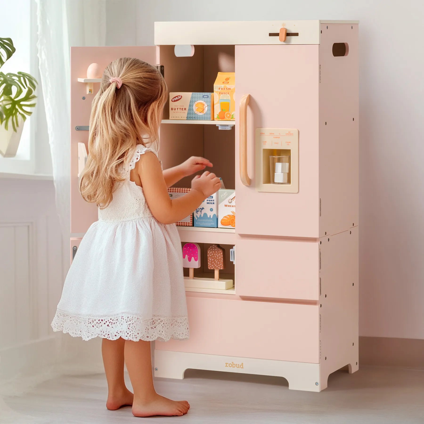 Il frigorifero include una divertente manopola della temperatura regolabile che consente ai bambini di fingere di controllare la temperatura del frigorifero, migliorando la loro esperienza di gioco di ruolo e la comprensione degli elettrodomestici del mondo reale.