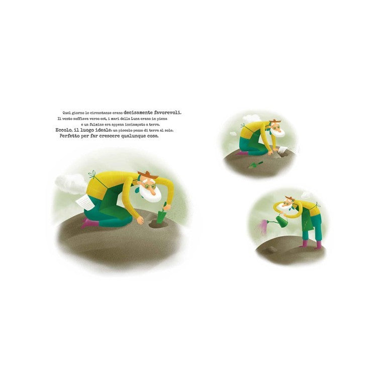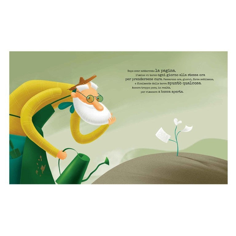 In una fiabesca terra senza nome, un vecchio omino scrive a macchina su di un foglio bianco che, annaffiato e coltivato amorevolmente, dà vita a uno, due, cento, mille volumi popolati da storie e creature fantastiche, capaci di raggiungere ogni lettore in grado di coglierne la magia. Il libro si presenta come una poetica dedica illustrata alle prime pagine della vita di ciascun amante dei libri e alle tante avventure scritte per aprire le porte della fantasia.