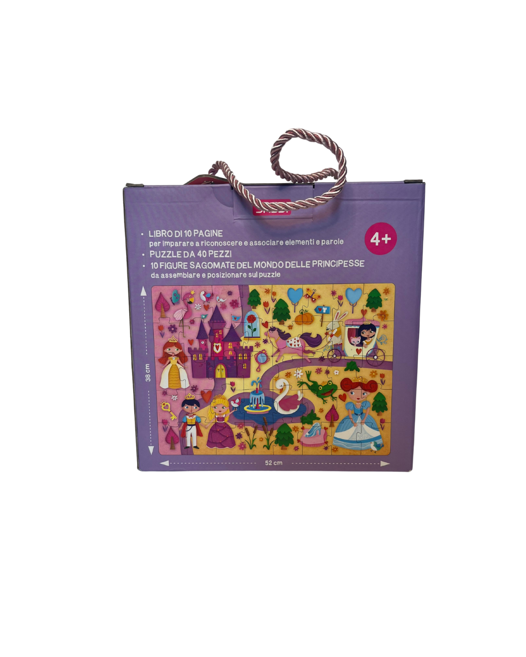 Una scatola abbellita da dettagli iridescenti che contiene un libro di 10 pagine, un puzzle di 40 pezzi e 10 figure sagomate del mondo delle principesse da assemblare e posizionare sul puzzle, per imparare a riconoscere e ad associare elementi e parole.