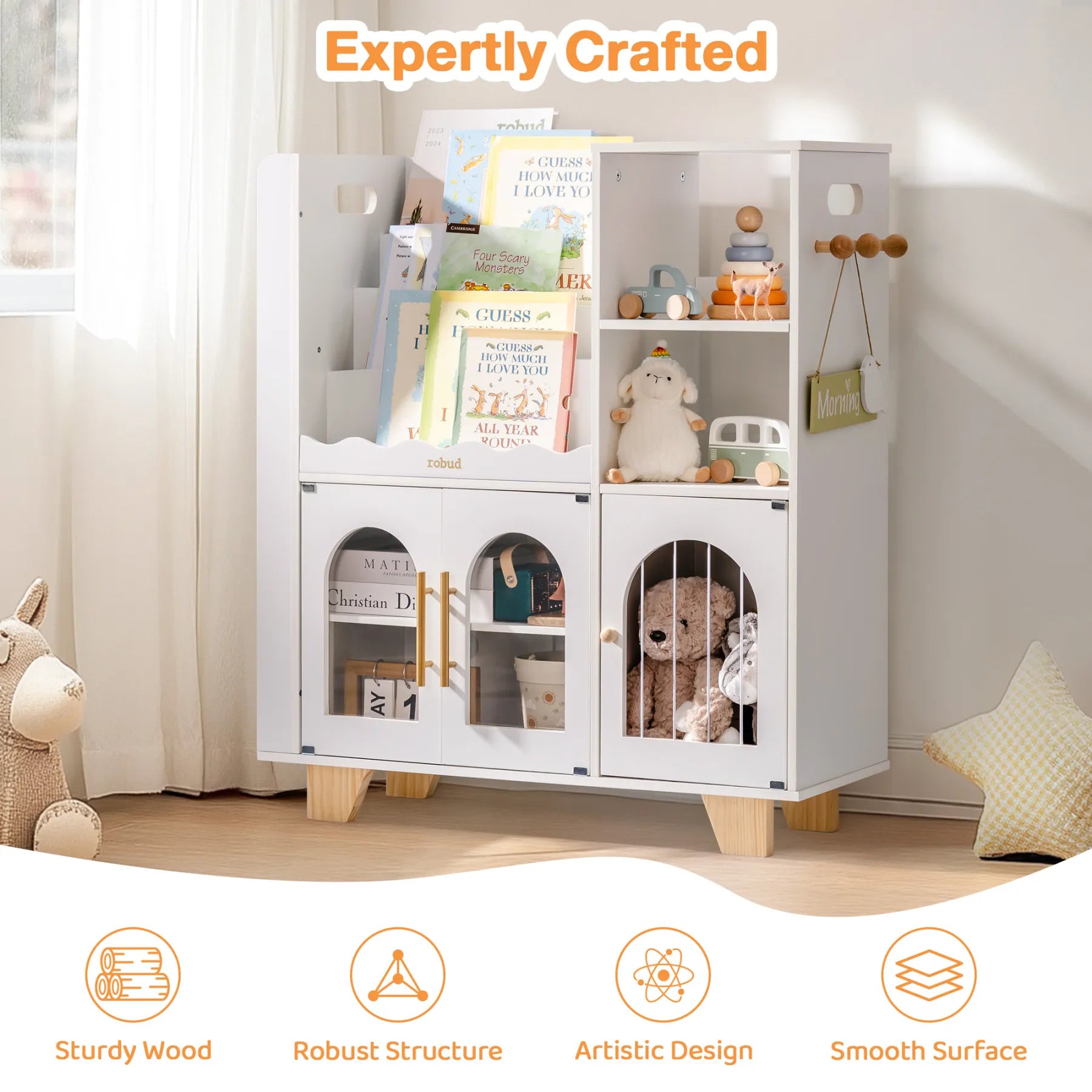 ORGANIZZATORE PER GIOCHI 6-IN-1: Mantieni la stanza dei giochi o la camera da letto del tuo bambino ordinata e pulita con questo versatile organizzatore! Dotato di uno scaffale per libri a più livelli, libreria, ripiani aperti, eleganti armadietti con porte ad arco, uno scaffale per libri montato lateralmente e ganci, offre un perfetto spazio di stoccaggio per libri, giocattoli, materiali artistici e altro ancora.
